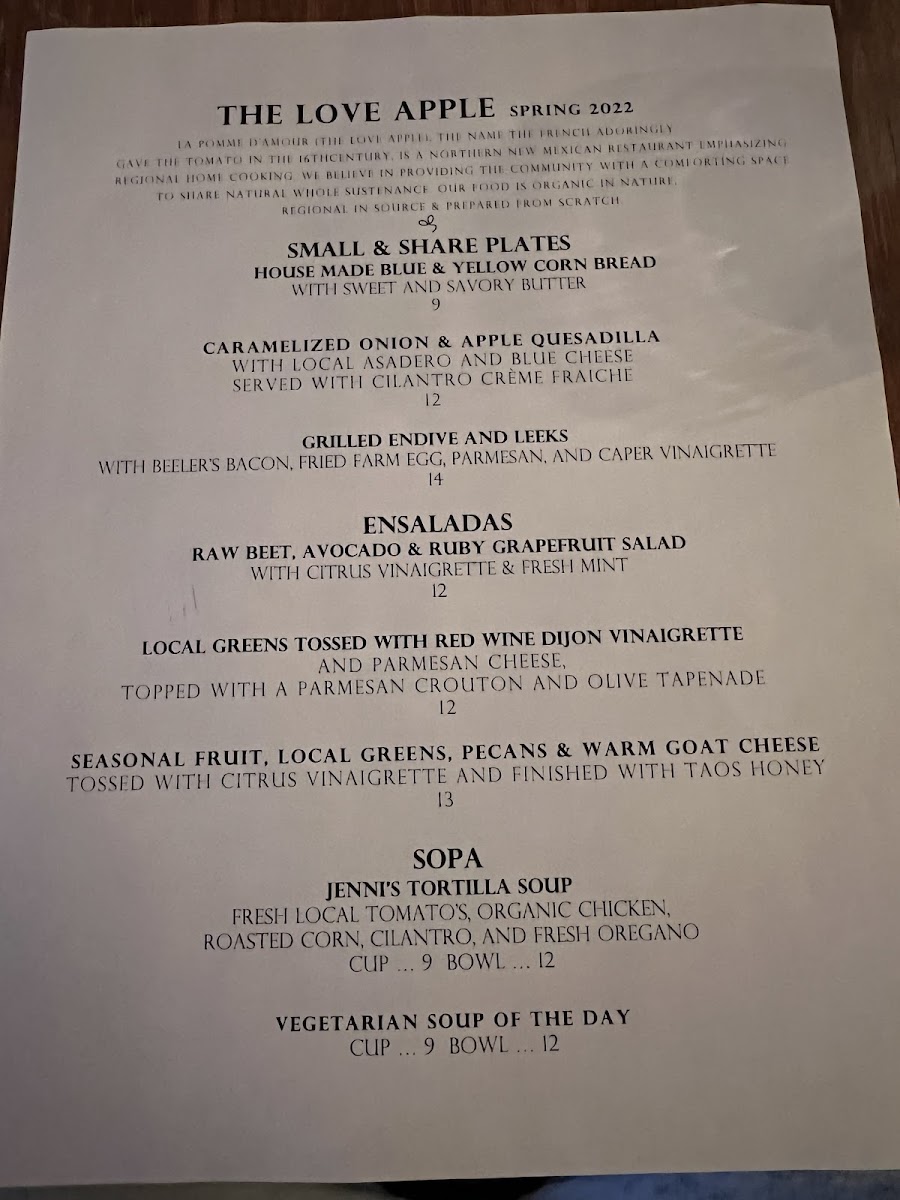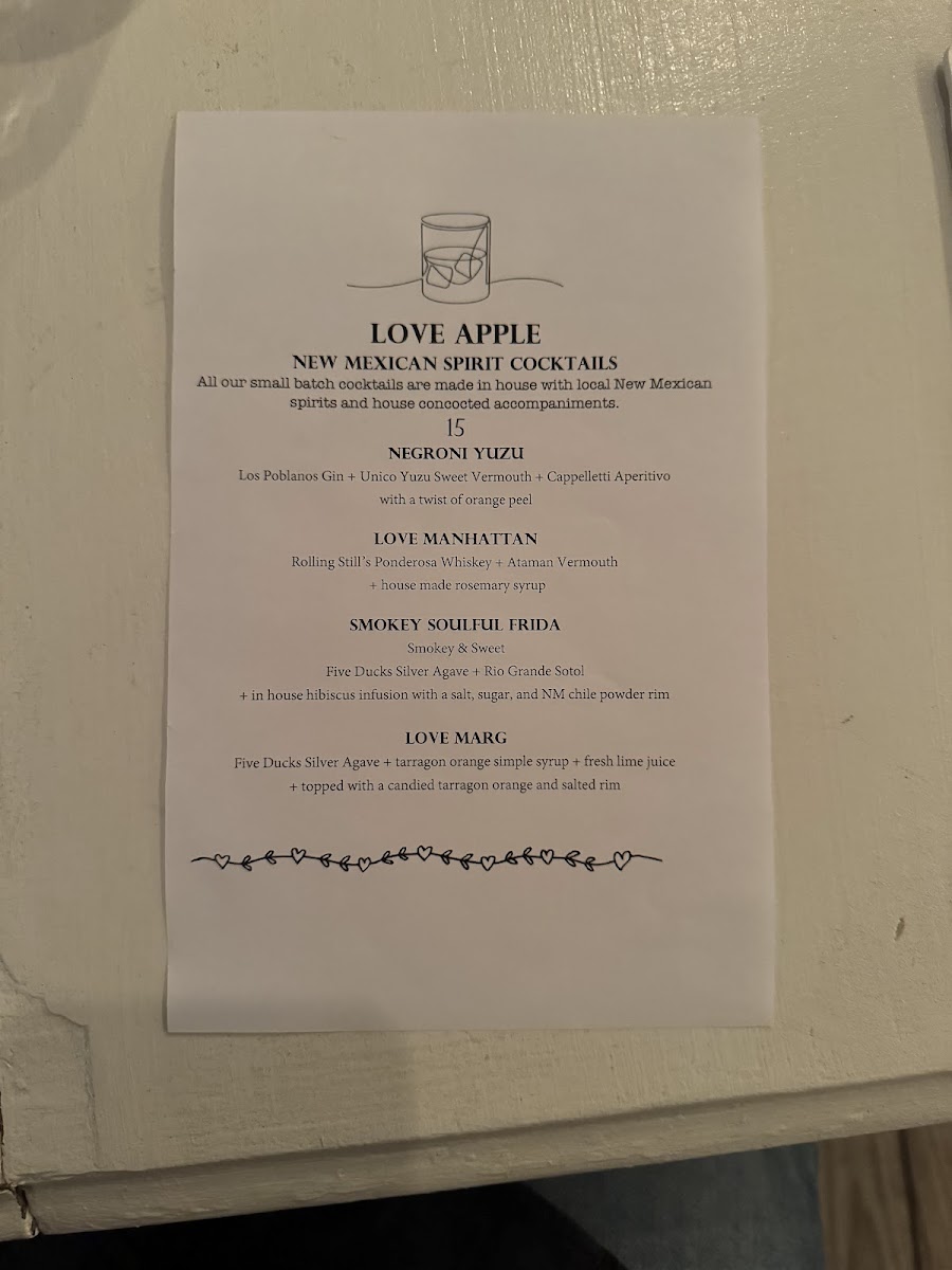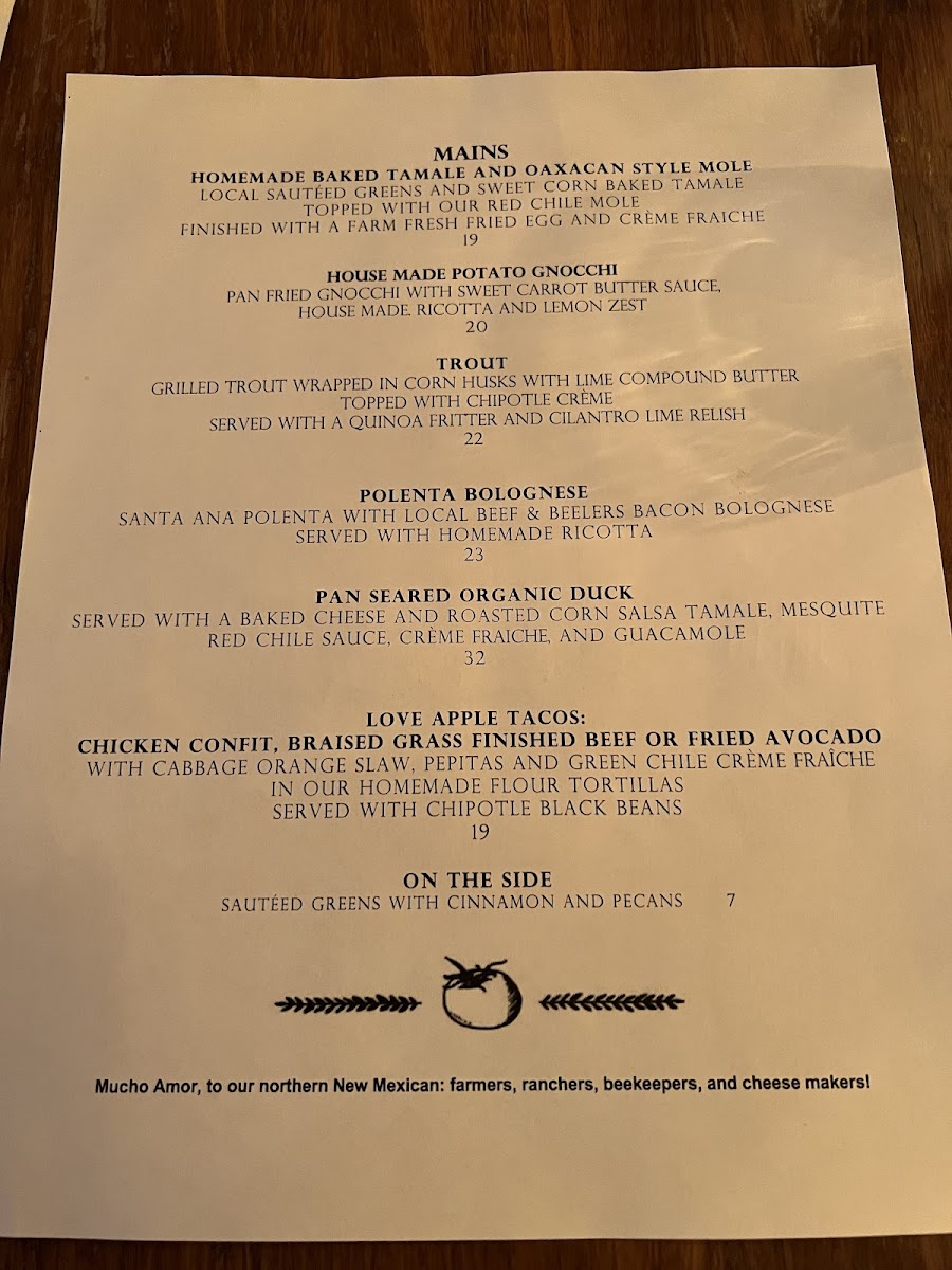 Welcome to The Love Apple, a culinary gem nestled in Taos, New Mexico. Renowned for its unique dining experience, this intimate restaurant offers a menu that highlights fresh, locally sourced ingredients combined in remarkable ways. Guests rave about dishes like the polenta bolognese and fried avocado tacos, both beautifully plated and bursting with flavor. The ambiance is warm and inviting, perfect for special occasions or a cozy dinner.