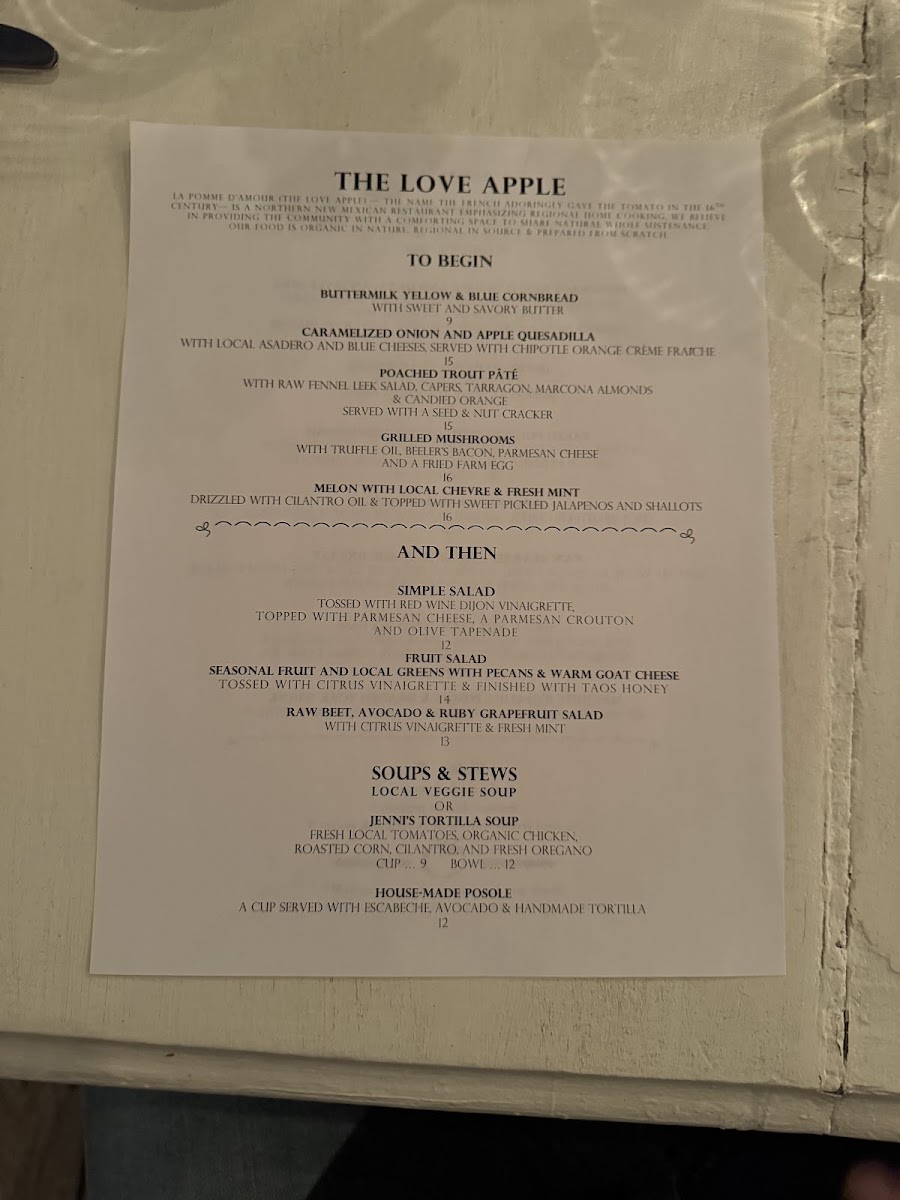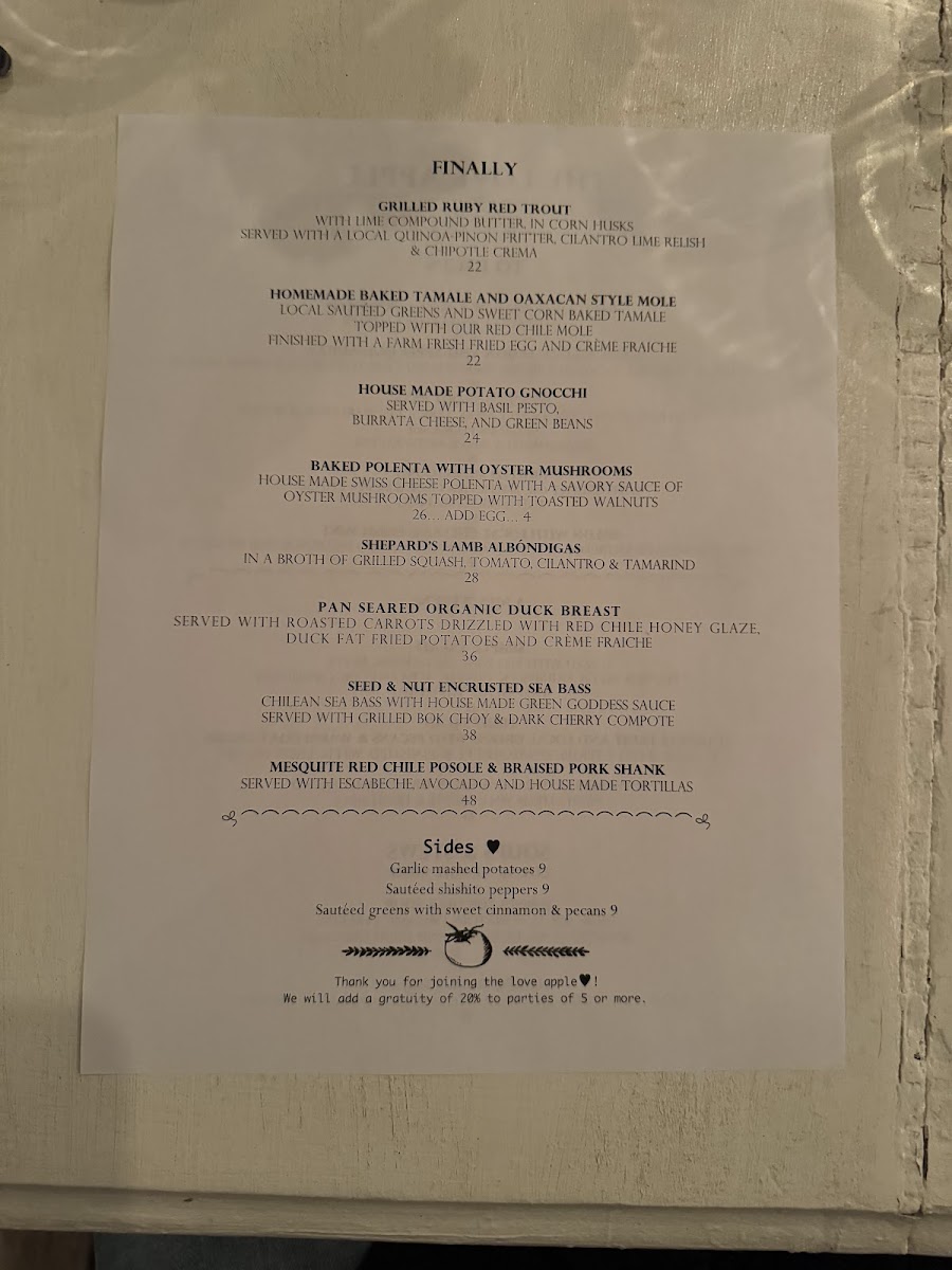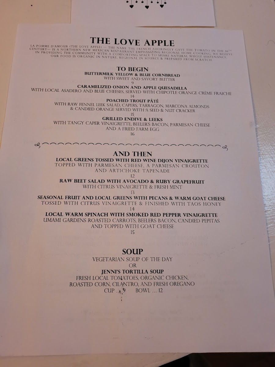 Welcome to The Love Apple, a culinary gem nestled in Taos, New Mexico. Renowned for its unique dining experience, this intimate restaurant offers a menu that highlights fresh, locally sourced ingredients combined in remarkable ways. Guests rave about dishes like the polenta bolognese and fried avocado tacos, both beautifully plated and bursting with flavor. The ambiance is warm and inviting, perfect for special occasions or a cozy dinner.